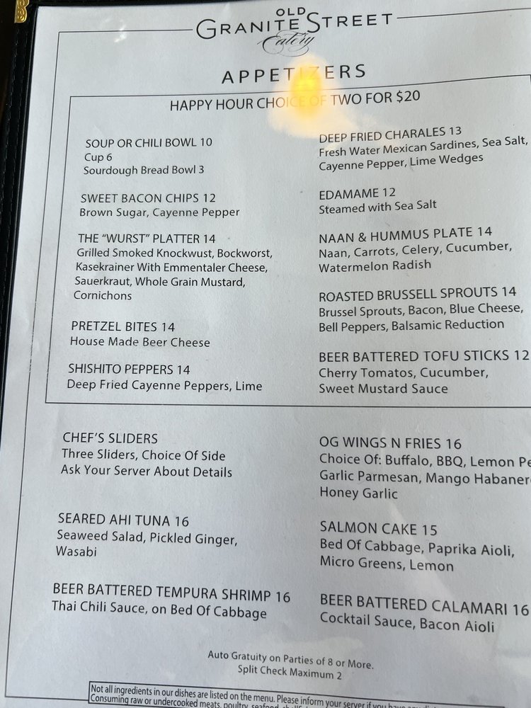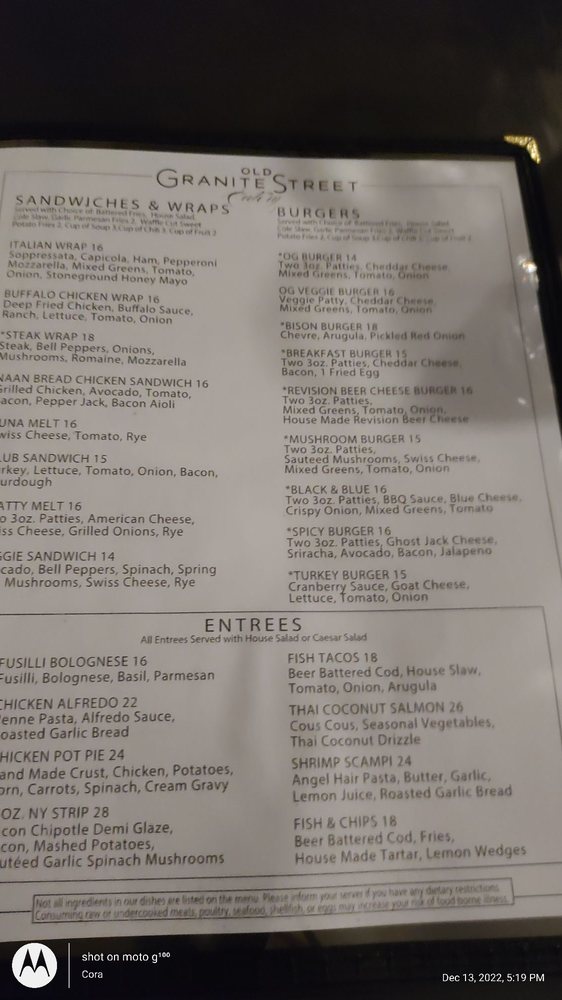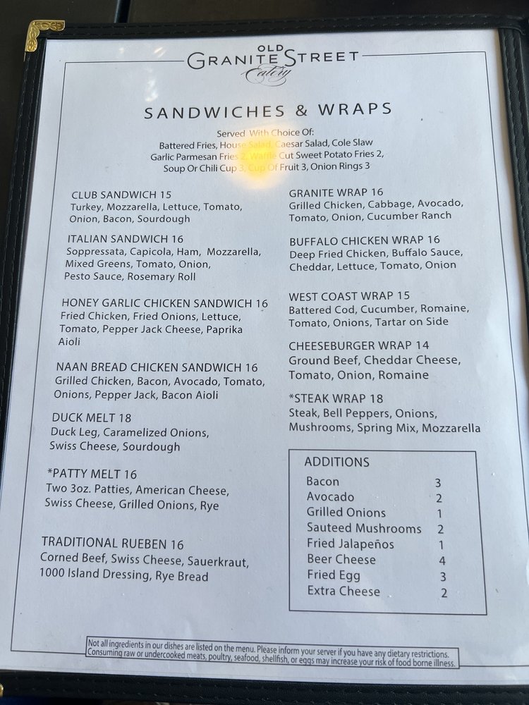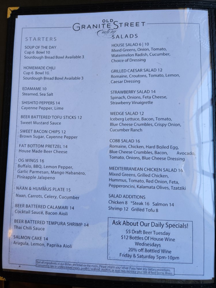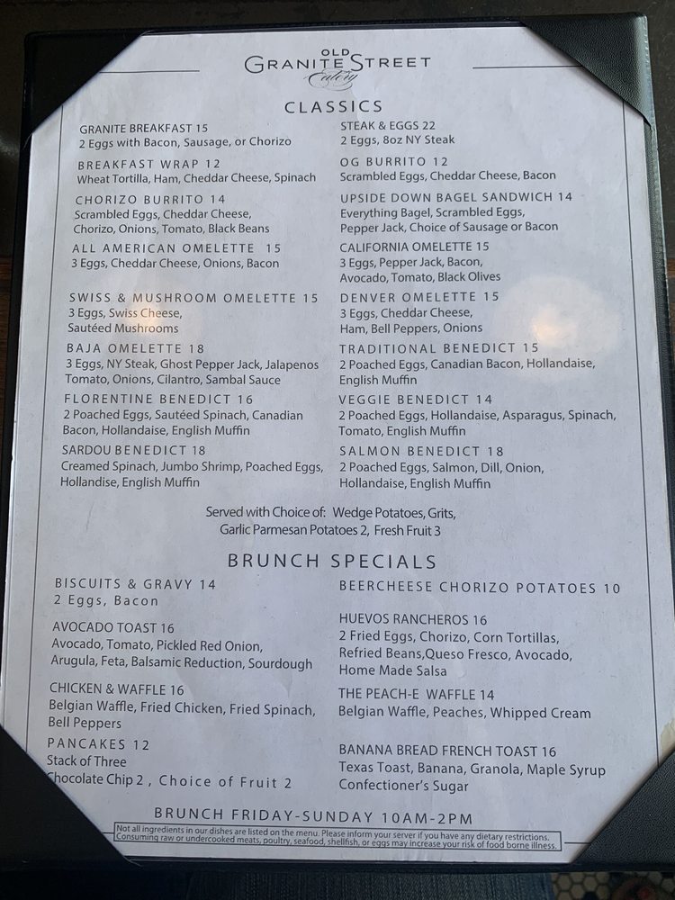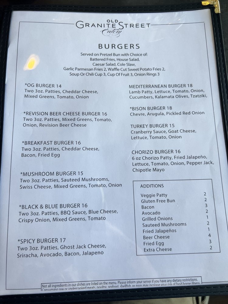 Old Granite Street Eatery in Reno, NV offers a wide range of options for all visitors. With a focus on burgers, their OG Veggie Burger and Big Bison with Chevre are standout choices. For breakfast, try their Best Breakfast Sandwich. For appetizers, the Shishito Peppers and Garlic Parmesan Crispy Fries are crowd-pleasers. Reviews highlight the cozy atmosphere, diverse drink selection, and tasty dishes. The decor adds a vintage charm while the attentive service enhances the dining experience. Prices are reasonable, making it a great spot for a meal out. Overall, Old Granite Street Eatery combines delicious food with a welcoming ambiance, earning it praise from satisfied customers.